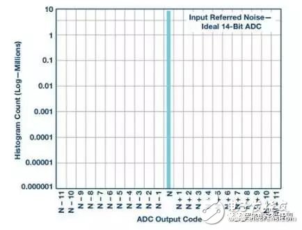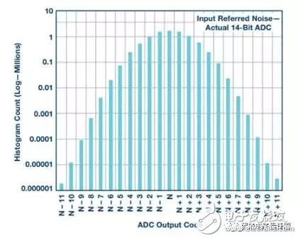 折合到輸入端的噪聲是ADC轉(zhuǎn)換缺陷的一個(gè)固有分量,其中包括ADC輸入端的熱噪聲。常常利用ADC輸入端開路或浮空情況下的數(shù)字輸出碼直方圖來對其進(jìn)行量化。ADC數(shù)據(jù)手冊通常會(huì)說明并顯示此噪聲。下面的圖形給出了此噪聲幅度的例子,其在本例中為[N] ±11。
