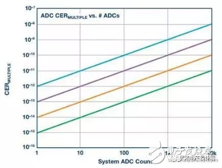 圖7. 使用多個(gè)轉(zhuǎn)換器的系統(tǒng)的CER正比于單個(gè)轉(zhuǎn)換器的CER乘以ADC數(shù)量。