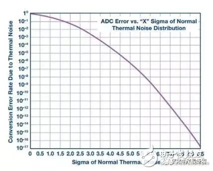 圖5. ADC轉(zhuǎn)換誤差率與其熱噪聲的關(guān)系通常只能通過晶體管級電路仿真獲得。上圖為一個(gè)12位ADC的示例圖,要實(shí)現(xiàn)10-15的CER,其必須能承受8 Σ的熱噪聲。