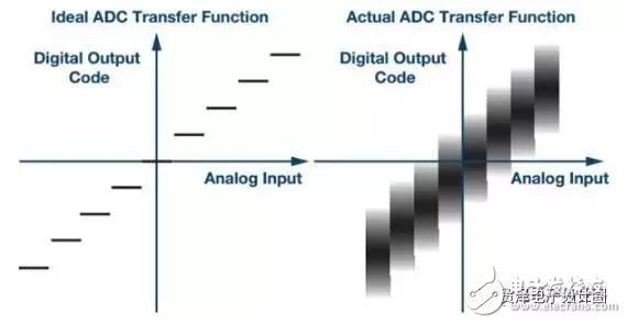 圖1. 對于滿量程上模擬分辨率的各個(gè)位,理想ADC樣本都有單一數(shù)字輸出(左圖)。實(shí)際ADC輸出行為的一個(gè)例子(右圖)顯示了與內(nèi)部和外部噪聲相關(guān)的某種模糊性。