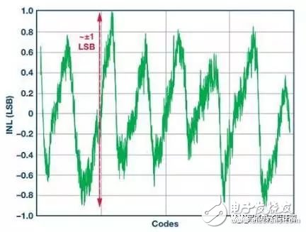 圖4. INL曲線示例,在所有ADC編碼上測量,與理想樣本相比,最大誤差為±1 LSB或±1個(gè)碼,對ADC轉(zhuǎn)換誤差而言基本上可忽略不計(jì)。