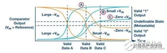 在一組比較器中,當(dāng)比較器基準(zhǔn)電壓精確等于或極其接近待比較的電壓時(shí),便可能發(fā)生亞穩(wěn)態(tài)狀況。比較電壓在幅度上越接近基準(zhǔn)電壓,比較器作出全面判斷所需的時(shí)間就越長。如果二者之間的電壓差非常小或?yàn)?,比較器可能沒有足夠的時(shí)間來最終判定比較電壓是高于還是低于基準(zhǔn)電壓。當(dāng)該樣本的轉(zhuǎn)換完成時(shí),比較器輸出可能處于亞穩(wěn)第三態(tài),而不是清晰地判定一個(gè)有效邏輯輸出1或0。這種猶豫不定會(huì)波及整個(gè)ADC,可能引起轉(zhuǎn)換錯(cuò)誤。