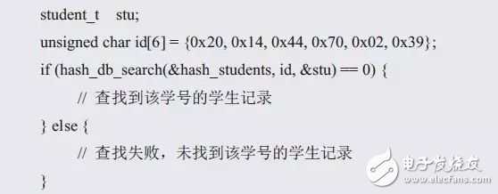 hash_db_search()接口通過(guò)關(guān)鍵字查找與之對(duì)應(yīng)的記錄,查找記錄時(shí),需要指定關(guān)鍵字信息,同時(shí)還需要使用一個(gè)指向記錄的指針獲取查找到的記錄值,其函數(shù)原型(hash_db.h)如下: