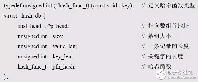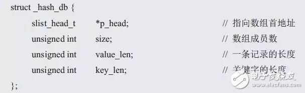 在結(jié)構(gòu)體中,需要包含哪些哈希表的相關(guān)信息呢?鏈?zhǔn)焦1淼暮诵氖且粋€(gè)slist_head_t類(lèi)型的數(shù)組,其大小與分組數(shù)目相關(guān)。為了通用,分組數(shù)目應(yīng)由用戶(hù)根據(jù)實(shí)際情況確定。slist_head_t類(lèi)型的數(shù)組信息由一個(gè)指向數(shù)組首地址的slist_head_t*類(lèi)型的指針和一個(gè)指定數(shù)組大小的size構(gòu)成,哈希表結(jié)構(gòu)體類(lèi)型的定義如下: