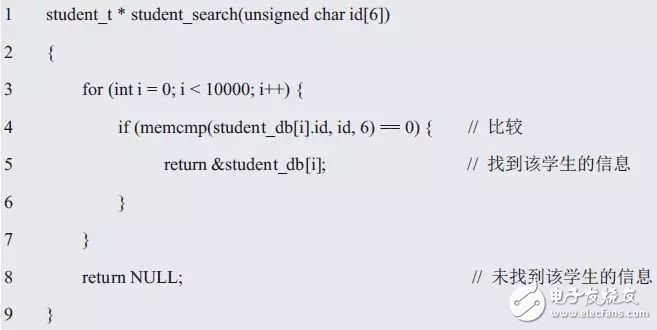 此時(shí),通過(guò)學(xué)號(hào)查找學(xué)生信息的方法也很簡(jiǎn)單,直接從第一個(gè)學(xué)生記錄開(kāi)始,順序遍歷各個(gè)學(xué)生記錄,將記錄中的學(xué)號(hào)與期望查找的學(xué)生學(xué)號(hào)相比較,學(xué)號(hào)相同即查找到了相應(yīng)學(xué)生的信息,詳見(jiàn)程序清單3.61。