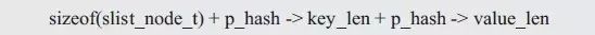 程序分配了一個(gè)結(jié)點(diǎn)的空間,該結(jié)點(diǎn)的空間需要存儲(chǔ)一個(gè)slist_node_t類(lèi)型鏈表結(jié)點(diǎn),便于添加結(jié)點(diǎn)到鏈表中,存儲(chǔ)長(zhǎng)度為p_hash->key_len的關(guān)鍵字,存儲(chǔ)長(zhǎng)度為p_hash->value_len的記錄值,詳見(jiàn)圖3.26,其內(nèi)存的大小為: