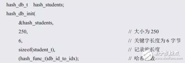 hash_db_init()接口用于哈希表實(shí)例的初始化,在定義哈希表結(jié)構(gòu)體類(lèi)型時(shí),哈希表數(shù)組大小、記錄長(zhǎng)度、關(guān)鍵字長(zhǎng)度和哈希函數(shù)都需要由用戶(hù)根據(jù)實(shí)際情況確定,其函數(shù)原型定義如下(hash_db.h):