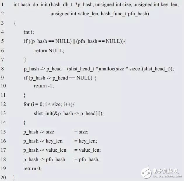 在初始化函數(shù)的實(shí)現(xiàn)中,需要按照size指定的大小分配內(nèi)存,用于存儲(chǔ)哈希表的各個(gè)表項(xiàng)(鏈表頭),接著需要完成各個(gè)鏈表頭和結(jié)構(gòu)體成員的初始化,初始化函數(shù)的實(shí)現(xiàn)范例詳見(jiàn)程序清單3.63。