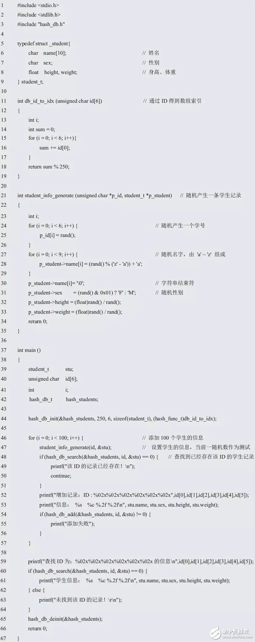 在存儲(chǔ)或查找記錄時(shí),可以通過(guò)與關(guān)鍵字(比如,學(xué)號(hào)ID)比較找到哈希表中的索引值,然后在對(duì)應(yīng)的表項(xiàng)中添加或查找記錄。在存儲(chǔ)記錄時(shí),需要提供關(guān)鍵字和記錄;而在查找記錄時(shí),僅需提供關(guān)鍵字。由此可見(jiàn),關(guān)鍵字和記錄是兩個(gè)不同的概念,關(guān)鍵字具有特殊的作用,因此關(guān)鍵字和記錄應(yīng)該分別對(duì)待。對(duì)于學(xué)生信息管理系統(tǒng)來(lái)說(shuō),其關(guān)鍵字為學(xué)號(hào),長(zhǎng)度是6字節(jié),記錄包含姓名、性別、身高、體重等信息。因此,在學(xué)生記錄結(jié)構(gòu)體的定義中,將關(guān)鍵字ID分離出來(lái)。學(xué)生記錄的定義如下: