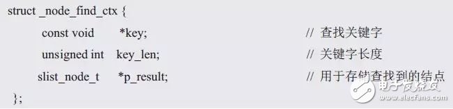 程序中,由于查找結(jié)點(diǎn)時(shí)需要遍歷鏈表,關(guān)鍵字比對(duì)的操作需要在遍歷函數(shù)的回調(diào)函數(shù)中完成,因此,需要將用戶(hù)查找記錄使用的關(guān)鍵字信息(關(guān)鍵字及其長(zhǎng)度)提供給回調(diào)函數(shù),同時(shí),當(dāng)查找到記錄時(shí),需要將查找到的結(jié)點(diǎn)反饋給調(diào)用遍歷函數(shù)的主程序。為此,定義了一個(gè)內(nèi)部使用的用于尋找一個(gè)結(jié)點(diǎn)的上下文結(jié)構(gòu)體: