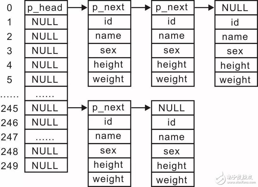 由于數(shù)組都是提前定義好大小的,動(dòng)態(tài)性能差,而鏈表的動(dòng)態(tài)性能更好,可以根據(jù)需要增加、刪除結(jié)點(diǎn),改變鏈表長(zhǎng)度,因此可以使用鏈表管理學(xué)生記錄,就算分布不均勻,也只存在鏈表長(zhǎng)度的差異,不會(huì)出現(xiàn)數(shù)據(jù)存儲(chǔ)不了的問(wèn)題,其示意圖詳見(jiàn)圖3.25。