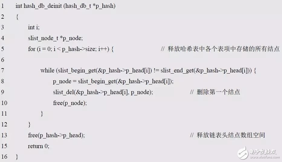 對(duì)應(yīng)于哈希表的初始化,用于當(dāng)不再使用哈希表時(shí),釋放相關(guān)的空間??梢远x其函數(shù)名為:hash_db_deinit()。需要通過(guò)參數(shù)指定需要解初始化的哈希表實(shí)例,可以定義函數(shù)的原型為(hash_db.h):