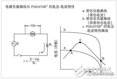 當(dāng) POSISTOR? 中流過(guò)的電流小于保護(hù)門限電流時(shí),在負(fù)載曲線 (a) 與 POSISTORr (c) 的電壓-電流特性曲線的交點(diǎn) (A) 處達(dá)到穩(wěn)定 (如圖6所示)。POSISTOR? 作為常態(tài)固定電阻工作。