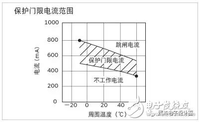 保護(hù)門限電流范圍取決于周圍溫度,電阻值,溫度特性和形狀。(如圖7所示)。跳閘電流最大值與不動(dòng)作電流最小值位于周圍溫度范圍 -10°C 到 +60°C 之內(nèi)。