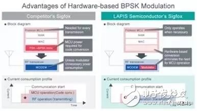 2. 業(yè)界首款用于Sigfox的BPSK(Binary Phase Shift Keying,二進(jìn)制相移鍵控)調(diào)制電路硬件化,有助于應(yīng)用實(shí)現(xiàn)更低功耗Sigfox使用以往的sub-GHz通信中未采用的BPSK調(diào)制方式。然而,由于以往支持標(biāo)準(zhǔn)Sigfox的LSIs不支持BPSK調(diào)制,所以有必要通過微控制器(MCU)軟件創(chuàng)建BPSK的符號數(shù)據(jù)。而這種方法在每次進(jìn)行無線通信時(shí),都必須驅(qū)動微控制器,產(chǎn)生不必要的功耗。而ML7404不僅支持Sigfox,還將BPSK調(diào)制電路硬件化。這樣,微控制器在無線通信工作過程中無需再涉及無線通信的物理層,可使通信系統(tǒng)實(shí)現(xiàn)更低功耗。
