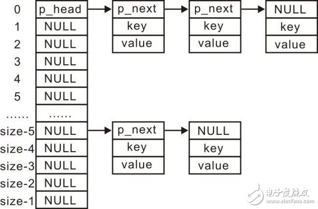 在初始化函數(shù)的實(shí)現(xiàn)中需要按照size指定的大小分配內(nèi)存,用于存儲(chǔ)哈希表的各個(gè)表項(xiàng)鏈表頭),接著需要完成各個(gè)鏈表頭和結(jié)構(gòu)體成員的初始化,初始化函數(shù)的實(shí)現(xiàn)范例詳見程序清單3.63。