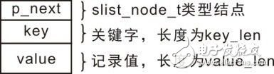 程序分配了一個(gè)結(jié)點(diǎn)的空間,該結(jié)點(diǎn)的空間需要存儲(chǔ)一個(gè)slist_node_t類型鏈表結(jié)點(diǎn),便于添加結(jié)點(diǎn)到鏈表中,存儲(chǔ)長度為p_hash->key_len的關(guān)鍵字,存儲(chǔ)長度為p_hash->value_len的記錄值,詳見圖3.26,其內(nèi)存的大小為