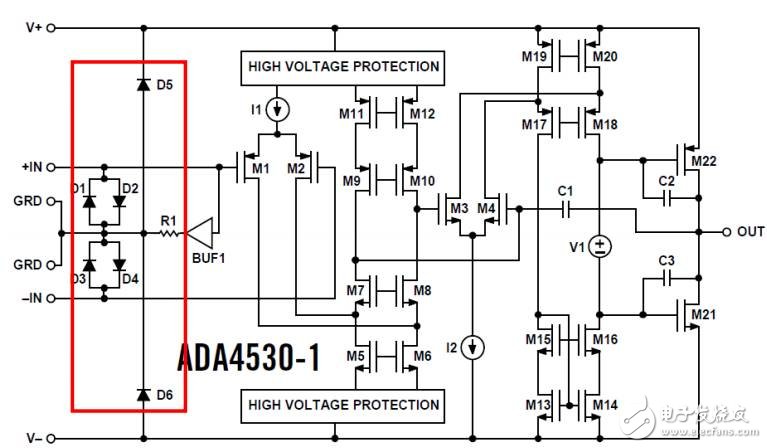 ADI推出的ADA4530采用偏置電流相對較小的CMOS工藝,但為提升ESD防護等級,加入了若干二極管,這些二極管將其ESD防護等級提升至4000V。為了Hold住隨之提高的偏置電流,ADI的工程師采用了一種特殊電路。如下圖所示,引入了一個緩沖器,這個緩沖器會強制D1、D2、D3、D4兩端的電壓相等,而二極管兩端的電壓如果一樣,就不會有電流流過二極管。ADI的工程師通過這種特殊設計,規(guī)避了引入ESD二極管導致的偏置電流升高的問題,使得ADA4530在擁有超低偏置電流的同時,ESD防護性能優(yōu)異。