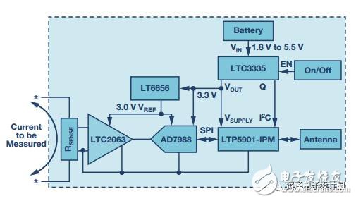 Linear Technology和ADI公司信號鏈、電源管理、無線組網(wǎng)產(chǎn)品的結(jié)合,使得我們可以設(shè)計真正的無線電流檢測電路。圖3顯示了一個實現(xiàn)示例。新型超低功耗斬波運算放大器LTC2063可以精確讀取檢測電阻上的小壓降。包括微功耗ADC和基準電壓源在內(nèi)的整個電路隨同檢測電阻的共模電壓浮空。只要一個小電池,納安功耗LTC3335開關(guān)穩(wěn)壓器便可為該電路供電數(shù)年之久,同時利用內(nèi)置庫侖計報告電池累計使用率。LTP5901-IPM無線模塊管理整個應(yīng)用,自動連接到一個高可靠性SmartMesh IP網(wǎng)絡(luò)。