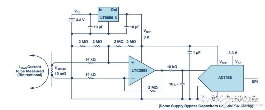圖2. 電流檢測電路隨同檢測電阻電壓浮空。斬波運算放大器LTC2063放大檢測電壓,把它偏置到AD7988 ADC的中間軌。LT6656-3提供精密3 V基準電壓源。