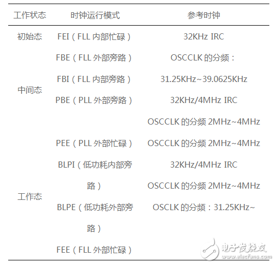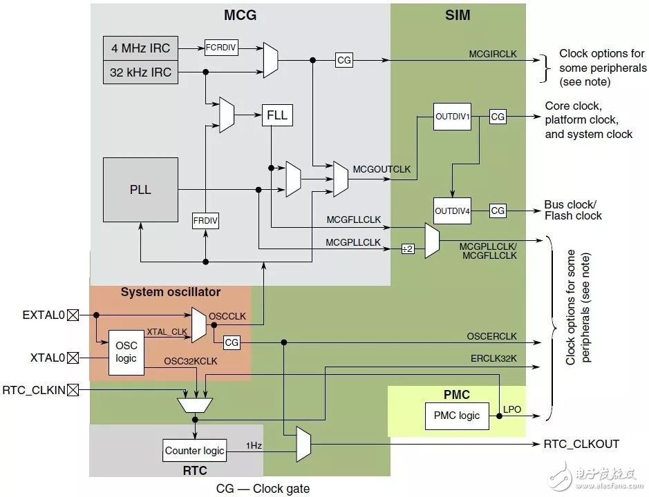 Kinetis系列MCU的時(shí)鐘系統(tǒng)可以通過內(nèi)外參考時(shí)鐘將頻率信號源接入到芯片,由多功能時(shí)鐘發(fā)生器MCG為各個(gè)功能模塊提供所需要的時(shí)鐘源,利用CG等門控模塊啟停系統(tǒng)功能模塊時(shí)鐘和時(shí)鐘分配機(jī)制為各功能模塊在滿足其工作要求的前提下選擇相對比較低的模塊工作頻率,這樣既可以做到功能模塊的正常工作以及保證功耗為最低。