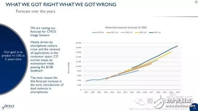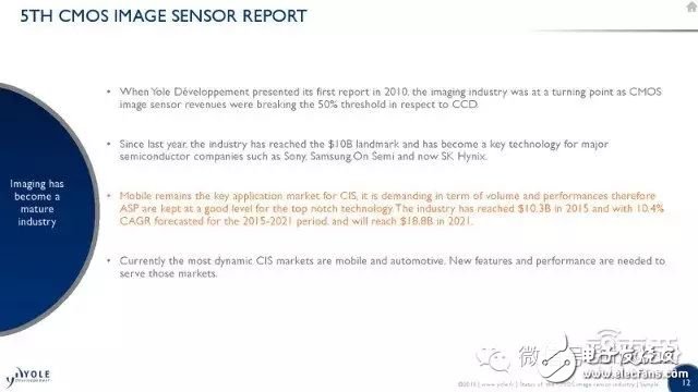 2010年Yole發(fā)布這一系列報(bào)告的第一篇時(shí),整個(gè)成像行業(yè)還處在一個(gè)轉(zhuǎn)折點(diǎn),那時(shí)CMOS(互補(bǔ)型金屬氧化物半導(dǎo)體感光元件)的市場收益才剛剛達(dá)到當(dāng)年主流CCD(電荷耦合器件攝像機(jī))的一半。