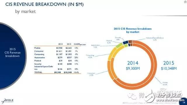 總體來看,2014年CMOS圖像傳感器市場總營收為93億美元,這一數(shù)字到2015年則達(dá)到了103億,復(fù)合增長率為10.4%。
