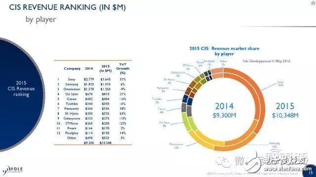 表現(xiàn)最搶眼的是索尼,其依靠在數(shù)字成像和移動(dòng)端應(yīng)用領(lǐng)域的技術(shù)優(yōu)勢,同時(shí)受益于智能手機(jī)雙攝像頭對圖像分辨率的需求,索尼在2015年贏得了這個(gè)市場下出貨量和營收的雙料冠軍。