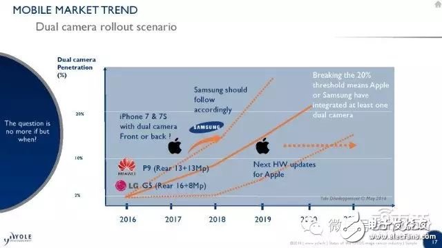 但是本文機(jī)構(gòu)從全球視角來看,還是認(rèn)為2016是雙攝爆發(fā)的元年,這一階段的代表機(jī)型包括LG G5、華為 P9以及iPhone 7 Plus。隨著三星加入雙攝趨勢,預(yù)計(jì)在2020年前后,雙攝智能手機(jī)的滲透率將超過20%。