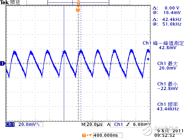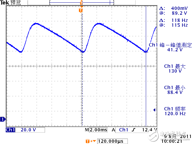 低頻紋波是與輸出電路的濾波電容容量相關(guān)。由于開關(guān)電源體積的限制,電解電容的容量不可能無限制地增加,導(dǎo)致輸出低頻紋波的殘留,該輸出紋波頻率隨整流電路方式的不同而不同。