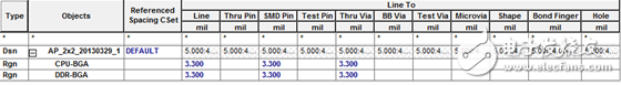 4. 還有一種可能需要的規(guī)則,就是區(qū)域規(guī)則。Allegro中默認(rèn)的線寬線距都是5mil,在CPU引腳比較密集的時(shí)候,這樣的規(guī)則是無法滿足的,這就需要在CPU或DDR芯片周圍設(shè)定允許小間距,小線寬的區(qū)域規(guī)則,如下圖: