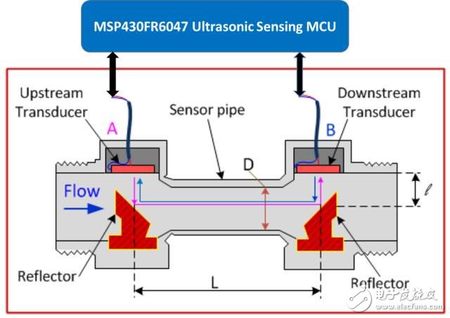 一對(duì)超聲波換能器可以直接與MSP430FR6047 MCU集成的超聲波外設(shè)(USS)連接。USS使用高速8MSPS的Σ-Δ ADC可以靈活的對(duì)每個(gè)傳感器進(jìn)行獨(dú)立的激勵(lì)和響應(yīng)捕獲。USS再將捕獲的波形采用多種數(shù)字信號(hào)處理算法進(jìn)行下一步處理。MSP430FR6047 MCU中采用的波形捕獲技術(shù)和處理方法能夠得到一流的分辨率(<5ps) —— 對(duì)住宅和工業(yè)應(yīng)用中的液體和氣體流量檢測是一個(gè)突破性系統(tǒng)設(shè)計(jì)。