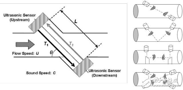安裝在流管內(nèi)部或外部的一對(duì)或多對(duì)超聲波傳感器可以用來測量TOF。圖4所示為簡易的超聲波測量原理和一些常見的超聲波傳感器布置撲。超聲波傳感器的選擇取決于待測流體的介質(zhì)類型。通常,待測流體為液體時(shí)使用頻率大于等于1MHz的超聲波傳感器,待測流體為氣體時(shí)使用頻率小于等于500kHz的超聲波傳感器。