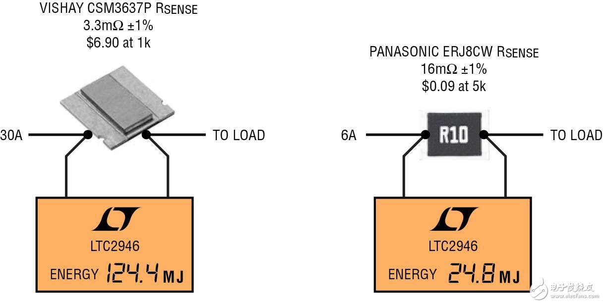 如果用 LTC2946 測量較小的電流,例如 6A 軌,那么需要 16m? 檢測電阻器,功耗則是更可接受的 0.57W。Digi-Key 銷售松下 ERJ8CW 16m? ±1% 1W 檢測電阻器,如圖 1b 所示,千片批購價為每片 0.09 美元,也可以接受。這款電阻器采用纖巧的 3.2mm x 1.6mm x 0.65mm 1206 封裝,不難安裝,也不會占用很大的電路板空間。其實,這構(gòu)成了一個準確度為 2.4% 的能量監(jiān)視解決方案,在-40°C 至 85°C 工作溫度范圍內(nèi)運行,對某些應用而言,這也許太不準確了。這個 2.4% 還不包括 LTC2946 和檢測電阻器之間的外部連接 (即引線和走線) 產(chǎn)生的熱電偶效應導致的任何不準確性。