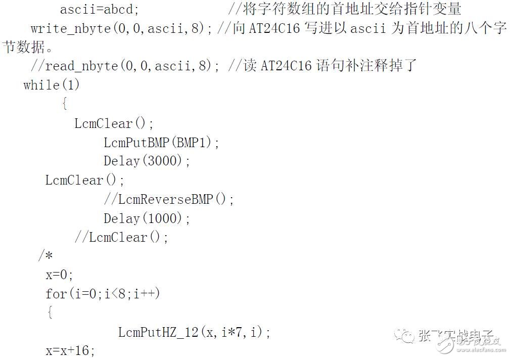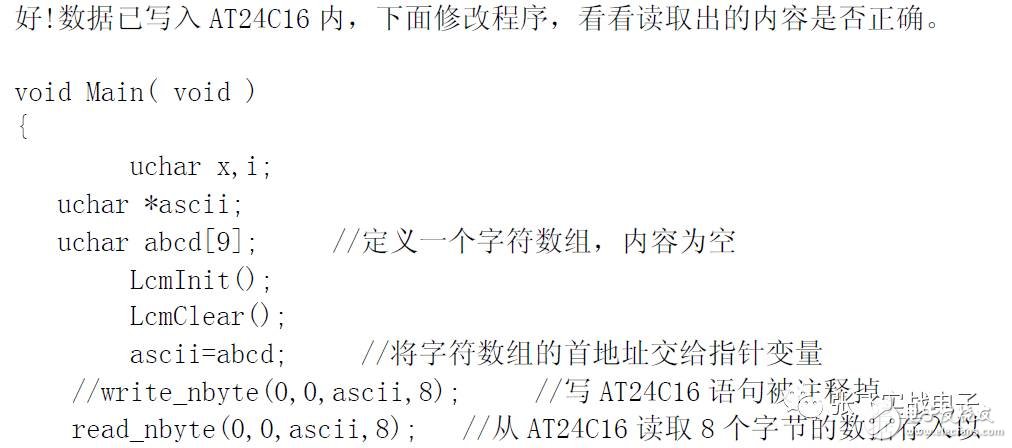OK,成功!這次"iic test"這行字符是從AT24C16 內(nèi)讀取的。你可以試著拔掉那兩根SDA,SCL 的數(shù)據(jù)線,再按下復(fù)位鍵重新運(yùn)行,你會(huì)發(fā)現(xiàn)那行“iic test”沒(méi)有顯示了。說(shuō)明沒(méi)有讀取到數(shù)據(jù)。再裝上數(shù)據(jù)線,重按復(fù)位鍵運(yùn)行,又正常了。后面就可以將存儲(chǔ)在S51 代碼段的字模,圖形數(shù)據(jù)等,都寫到AT24C16 里了。