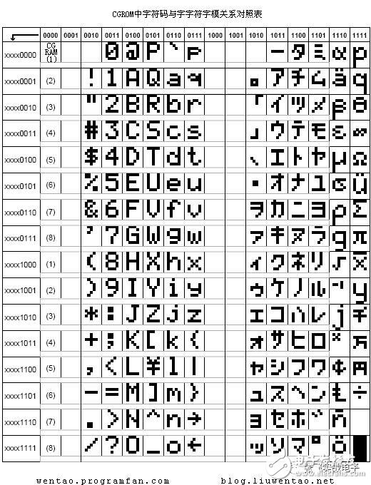 剛才我說(shuō)了想要在LCD1602 屏幕的第一行第一列顯示一個(gè)"A"字,就要向DDRAM 的00H 地址寫入“A”字的代碼41H 就行了,可41H 這一個(gè)字節(jié)的代碼如何才能讓LCD 模塊在屏幕的陣點(diǎn)上顯示“A”字呢?同樣,在LCD 模塊上也固化了字模存儲(chǔ)器,這就是CGROM 和CGRAM。HD44780 內(nèi)置了192 個(gè)常用字符的字模,存于字符產(chǎn)生器CGROM(Character Generator ROM)中,另外還有8 個(gè)允許用戶自定義的字符產(chǎn)生RAM,稱為CGRAM(Character Generator RAM)。下圖說(shuō)明了CGROM 和CGRAM 與字符的對(duì)應(yīng)關(guān)系。
