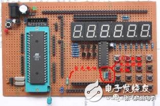 接下來(lái)就是確定電路。電路的接口與AT89S51 間有三組接口:段碼、位碼和電源。為了讓AT89S51 獨(dú)立出來(lái)這三級(jí)接口都采用插針做接口,用排線自由連接到AT89S51 的P1-P3 口,電源用短路帽連接,完成后的板子見(jiàn)下圖: