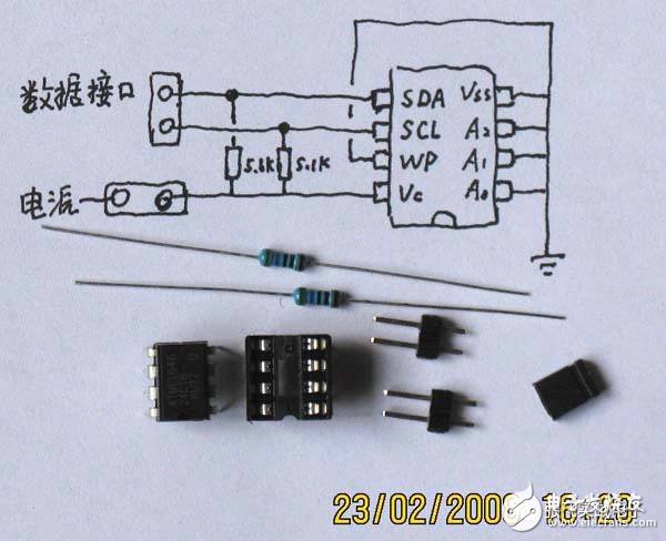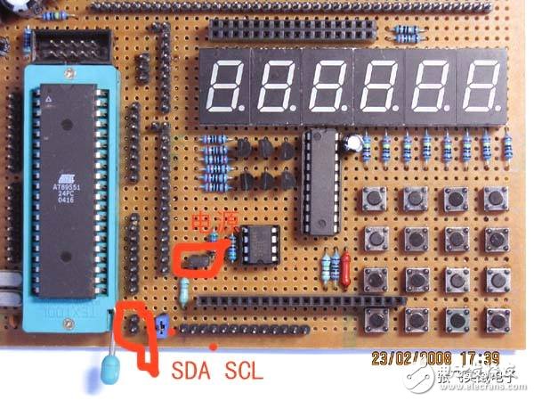 現(xiàn)在我們接上電源短路帽把AT24C16 電源接好。將兩個(gè)數(shù)據(jù)線用跳線接到P1.6和P1.7 口上(接到哪個(gè)口上可以自己選的)。注意分清哪個(gè)是SDA 哪個(gè)是SCL。別弄錯(cuò)了。