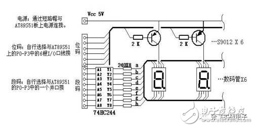 先不接上圖的R2 和74HC244,將數(shù)碼管一個(gè)段直接接地。調(diào)節(jié)R1,測(cè)得S9012基極電流為0.21mA 時(shí)集電極也就是數(shù)碼管上已有40mA,說(shuō)明放大倍數(shù)足夠了。這時(shí)接上R2 和74HC244,調(diào)節(jié)R2 使數(shù)碼管電流控制在15mA,這樣當(dāng)8 個(gè)段一起點(diǎn)亮?xí)r三極管上得通過(guò)120mA 的電流。而基極上需要0.63mA,為了減小三極管的負(fù)荷應(yīng)使三極管過(guò)飽和,,調(diào)節(jié)R1 使基極電流為2mA,此時(shí)測(cè)得集電極和漏極之間的電壓約0.1V。好!此時(shí)R1 為2K。R2 為240 歐姆。確定。