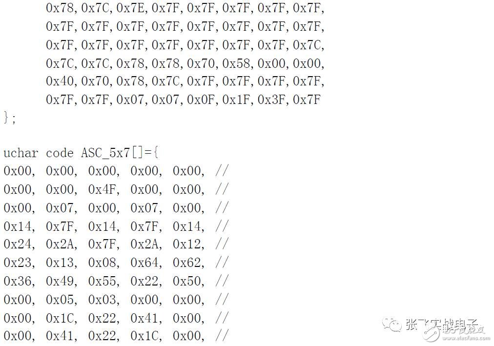 從上圖可以看出,“A”字的對(duì)應(yīng)上面高位代碼為0100,對(duì)應(yīng)左邊低位代碼為0001,合起來(lái)就是01000001,也就是41H。可見(jiàn)它的代碼與我們PC 中的字符代碼是基本一致的。因此我們?cè)谙駾DRAM 寫C51 字符代碼程序時(shí)甚至可以直接用P1='A'這樣的方法。PC 在編譯時(shí)就把“A”先轉(zhuǎn)為41H 代碼了。