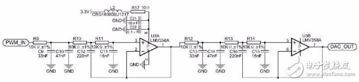 該電路由兩個(gè)三階低通濾波器級(jí)聯(lián)形成六階低通濾波器,用于衰減LPC824 輸出PWM信號(hào)的高頻成分,實(shí)現(xiàn)12 位分辨率DAC。