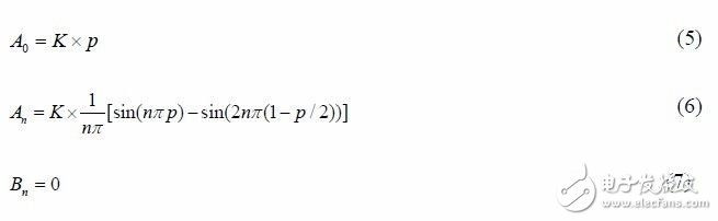 如果令K 表示PWM 信號(hào)f(t)的幅度,代入公式(2)~(4),f(t)的展開(kāi)系數(shù)分別如下: