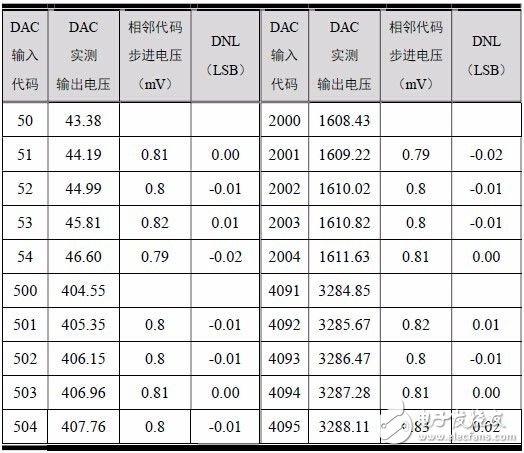 在DAC 輸入數(shù)字代碼范圍內(nèi),取若干點(diǎn)的DNL 測(cè)試驗(yàn)證(1LSB=3.3V/212=0.81mV),數(shù)據(jù)詳見(jiàn)表 3.1??梢钥闯?,DNL 最大值為0.02 個(gè)LSB。