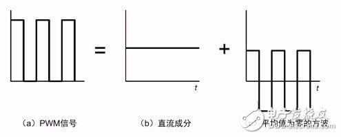 PWM(Pulse Width Modulation)是頻率固定、占空比變化的數(shù)字信號(hào),PWM 信號(hào)波形可以被分解為一個(gè)直流分量加上一個(gè)相同占空比,但平均幅度為零的新的方波,詳見(jiàn)圖3.1,由此可見(jiàn),這個(gè)直流分量的幅度正比于PWM 波形的占空比。