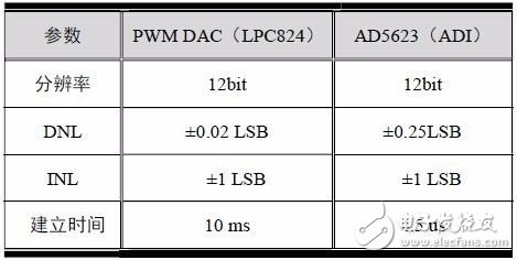 表中數(shù)據(jù)表明,LPC824 的PWM 外設(shè)結(jié)合本電路所實(shí)現(xiàn)DAC 有非常好的差分非線性(DNL)、線性度(INL),與獨(dú)立DAC 芯片基本一致。但建立時(shí)間慢,因此適合于輸出低頻、高精度的模擬信號(hào)。