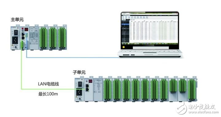 在測量場所比較分散時(shí),可采用多臺(tái)級聯(lián),測量現(xiàn)場與數(shù)據(jù)記錄儀可分開安裝,將子單元安裝在測量現(xiàn)場,主單元用來監(jiān)視數(shù)據(jù)。