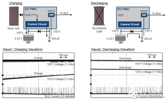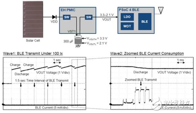 Wave1顯示了基于太陽(yáng)能的BLE運(yùn)行,Wave2顯示了發(fā)送時(shí)的BLE電流消耗。PMIC首先將太陽(yáng)能存儲(chǔ)到VSTORE1(VST1)上的一個(gè)300-μF陶瓷電容器上 。當(dāng)VST1達(dá)到VVOUTH時(shí),能量被發(fā)送到MCU用于BLE運(yùn)行。