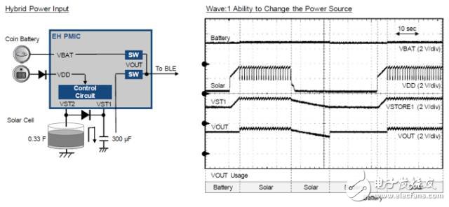 圖13中的框圖顯示了混合電源輸入控制模式。Wave1顯示的是PMIC如何控制兩個(gè)電源(太陽(yáng)能和電池)。PMIC通過(guò)轉(zhuǎn)換這兩個(gè)電源在不同場(chǎng)景下驅(qū)動(dòng)系統(tǒng)。環(huán)境光線通常是持續(xù)的,但某些地方可能沒(méi)有持續(xù)的光線。PMIC能夠自動(dòng)轉(zhuǎn)換這兩個(gè)電源,在沒(méi)有光線的情況下繼續(xù)供電。