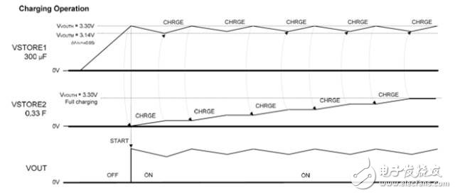 圖11中的框圖和波形顯示了混合儲(chǔ)能控制功能。用于運(yùn)行系統(tǒng)的能量存儲(chǔ)在VST1中,其余能量用于對(duì)VSTORE2(VST2)進(jìn)行充電。當(dāng)沒(méi)有環(huán)境光線時(shí),VST2中能持續(xù)為系統(tǒng)提供能量。