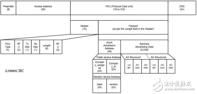 圖2顯示了廣播通道數(shù)據(jù)包格式的BLE鏈路層格式。BLE鏈路層擁有“Preamble”(前導(dǎo)碼)、“Access Address”(接入地址)、“Protocol Data Unit(PDU)”(協(xié)議數(shù)據(jù)單元)和“Cyclic Redundancy Code(CRC)”(循環(huán)冗余碼)。請(qǐng)注意,以下信息僅適用于廣播通道數(shù)據(jù)包格式,不含“數(shù)據(jù)通道數(shù)據(jù)包”。